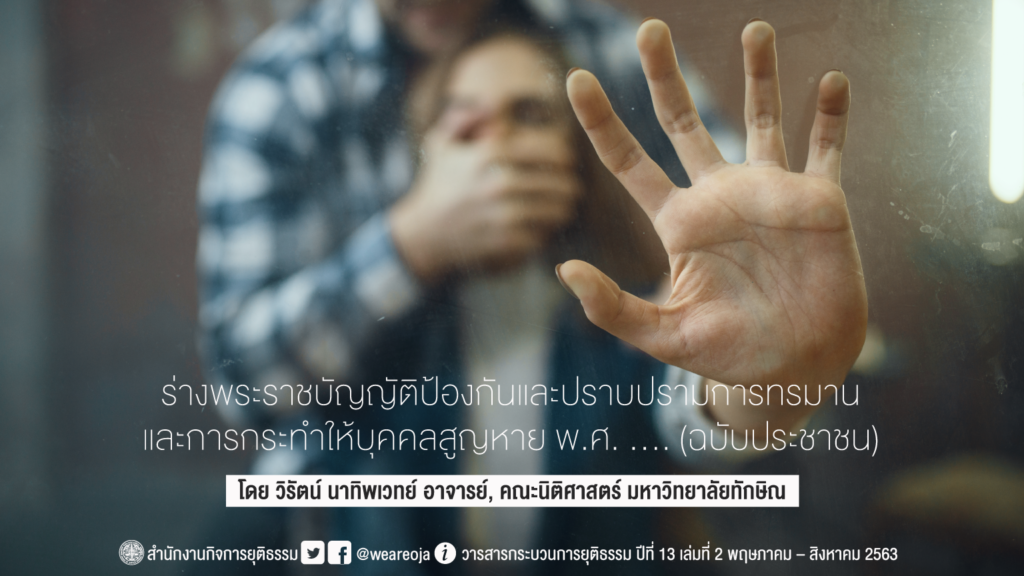 กระบวนการยุติธรรม/การดำเนินคดี ร่างพระราชบัญญัติป้องกันและปราบปรามการ ทรมานและการกระทำให้บุคคลสูญหาย พ.ศ. …. (ฉบับประชาชน) ศึกษากรณี โครงสร้างความรับผิด ทางอาญาฐานกระทำทรมาน Draft Prevention and Suppression of Torture and Enforced Disappearance Act B.E. …. (People version) A case study of the criminal liability structure for torture