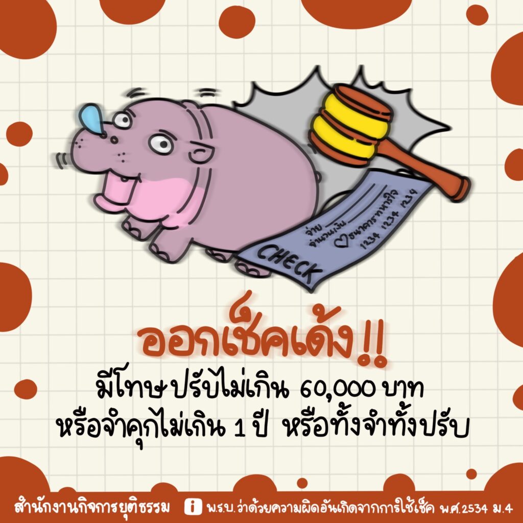 เมื่อได้มีการยื่นเช็คเพื่อให้ใช้เงินอันชอบด้วยกฎหมาย ถ้าธนาคารปฎิเสธไม่ให้ใช้เงินตามเช็คนั้น ผู้ออกเช็คมีความผิดต้องระวางโทษปรับไม่เกิน 60,000บาท หรือจำคุกไม่เกิน 1 ปี หรือทั้งปรับทั้งจำ”
