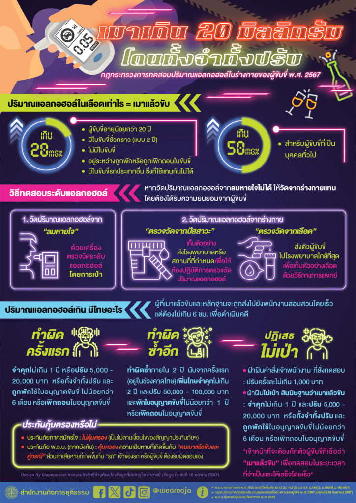- กฎกระทรวงการทดสอบกฎกระทรวงการทดสอบปริมาณแอลกอฮอล์ในร่างกายของผู้ขับขี่ พ.ศ. 2567 (บังคับใช้ 20 กันยายน2567)