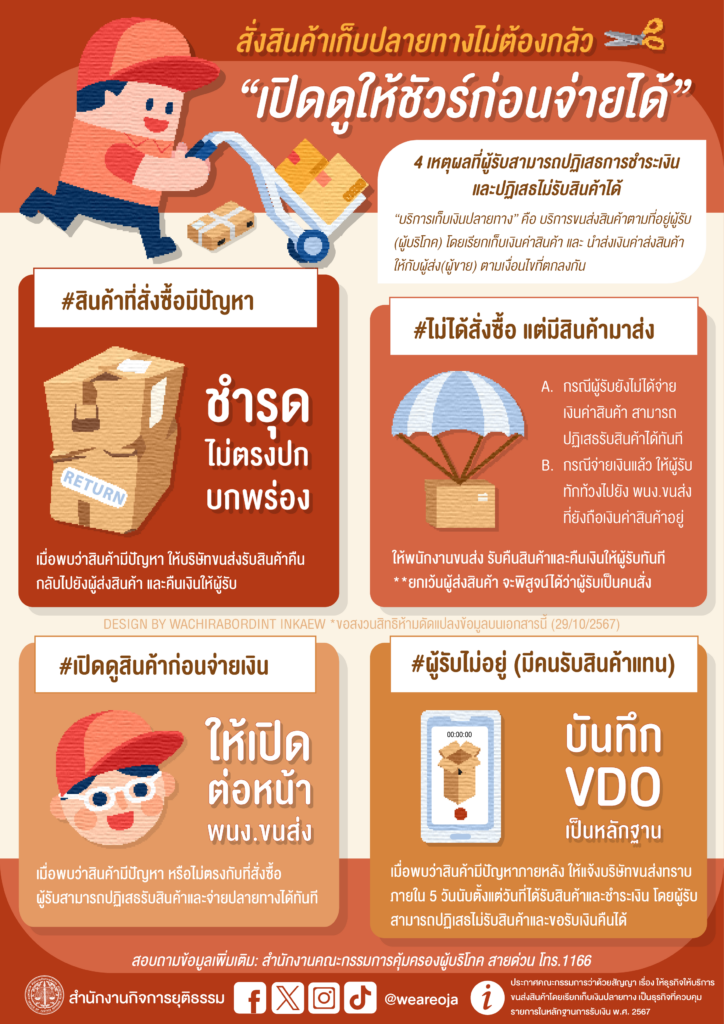 ซื้อสินค้าออนไลน์มีสิทธิ์แกะดูสินค้าก่อนจ่ายเงิน ตามประกาศคณะกรรมการว่าด้วยสัญญา เรื่อง ให้ธุรกิจให้บริการขนส่งสินค้าโดยเรียกเก็บเงินปลายทางเป็นธุรกิจที่ควบคุมรายการในหลักฐานการรับเงิน พ.ศ. 2567 ที่มีผลบังคับใช้แล้ว (3 ตุลาคม 2567) ให้สิทธิ์ผู้บริโภคตรวจสอบสินค้าก่อนชำระเงิน เพื่อแก้ปัญหาการถูกหลอกลวงและได้รับสินค้าไม่ตรงตามที่สั่งซื้อ