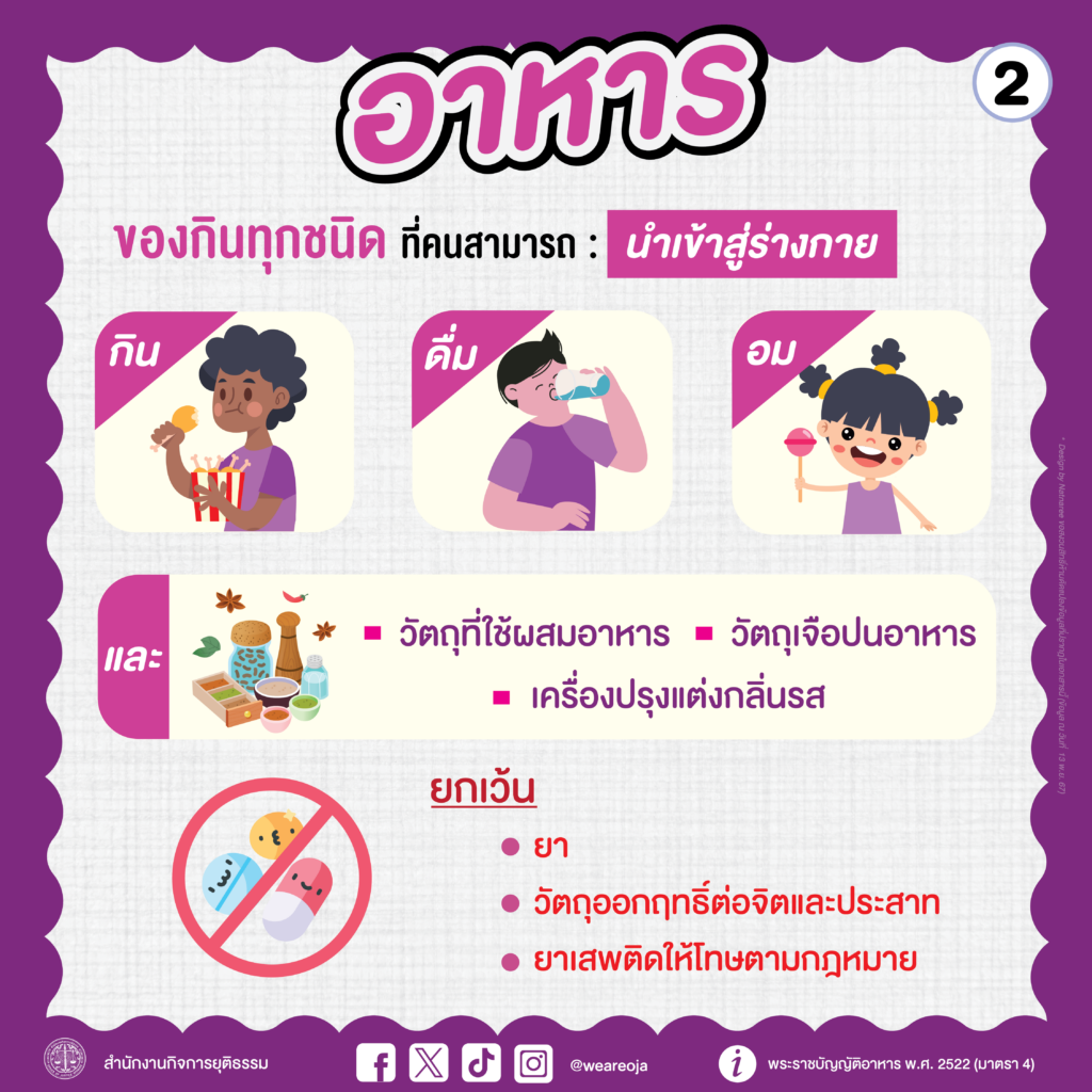 กิน ดื่ม อม และวัตถุที่ใช้ผสมอาหาร = วัตถุเจือปนอาหาร เครื่องปรุงแต่งกลิ่นรส ยกเว้น วัตถุออกฤทธิ์ต่อจิตและประสาท ยาเสพติดให้โทษตามกฎหมาย