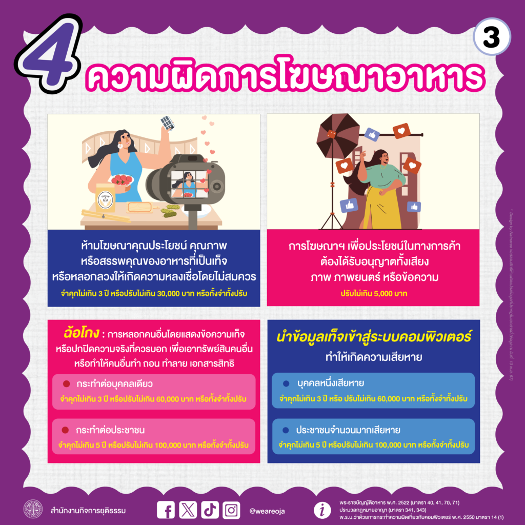 ห้ามโฆษณาคุณประโยชน์ คุณภาพหรือสรรพคุณของอาหารที่เป็นเท็จหรือหลอกลวงให้เกิดความหลงเชื่อโดยไม่สมควร จำคุกไม่เกิน 3 ปี หรือปรับไม่เกิน 30,000 บาท หรือทั้งจำทั้งปรับ