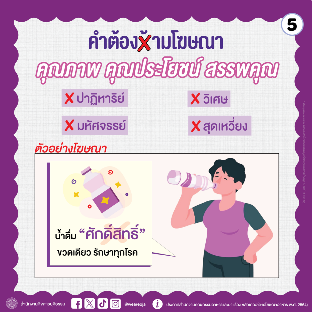 คำต้องห้ามโฆษณา คุณภาพ คุณประโยชน์ สรรพคุณ (1-5) ได้แก่ ปาฏิหาริย์ วิเศษ มหัศจรรย์ สุดเหวี่ยง ศักดิ์สิทธิ์