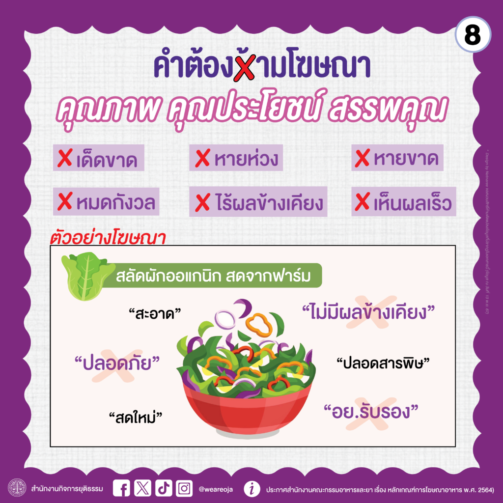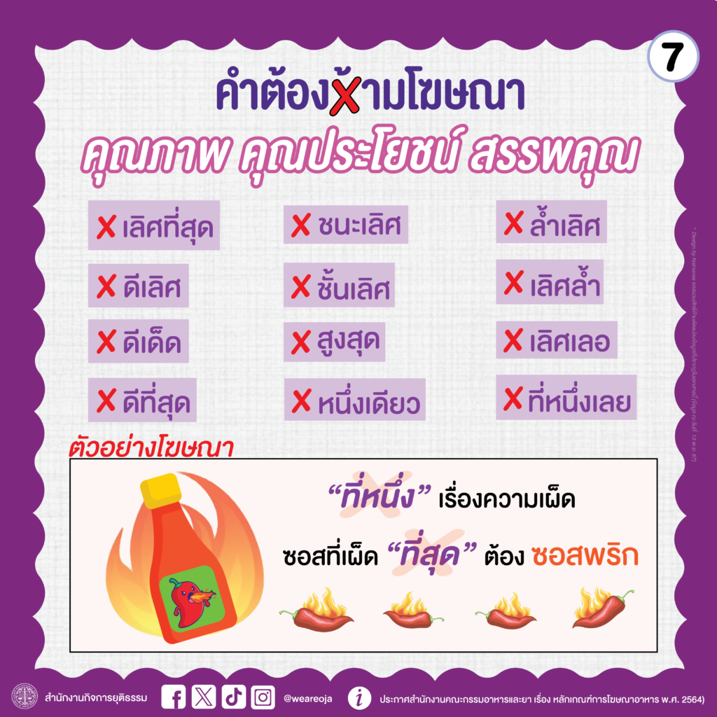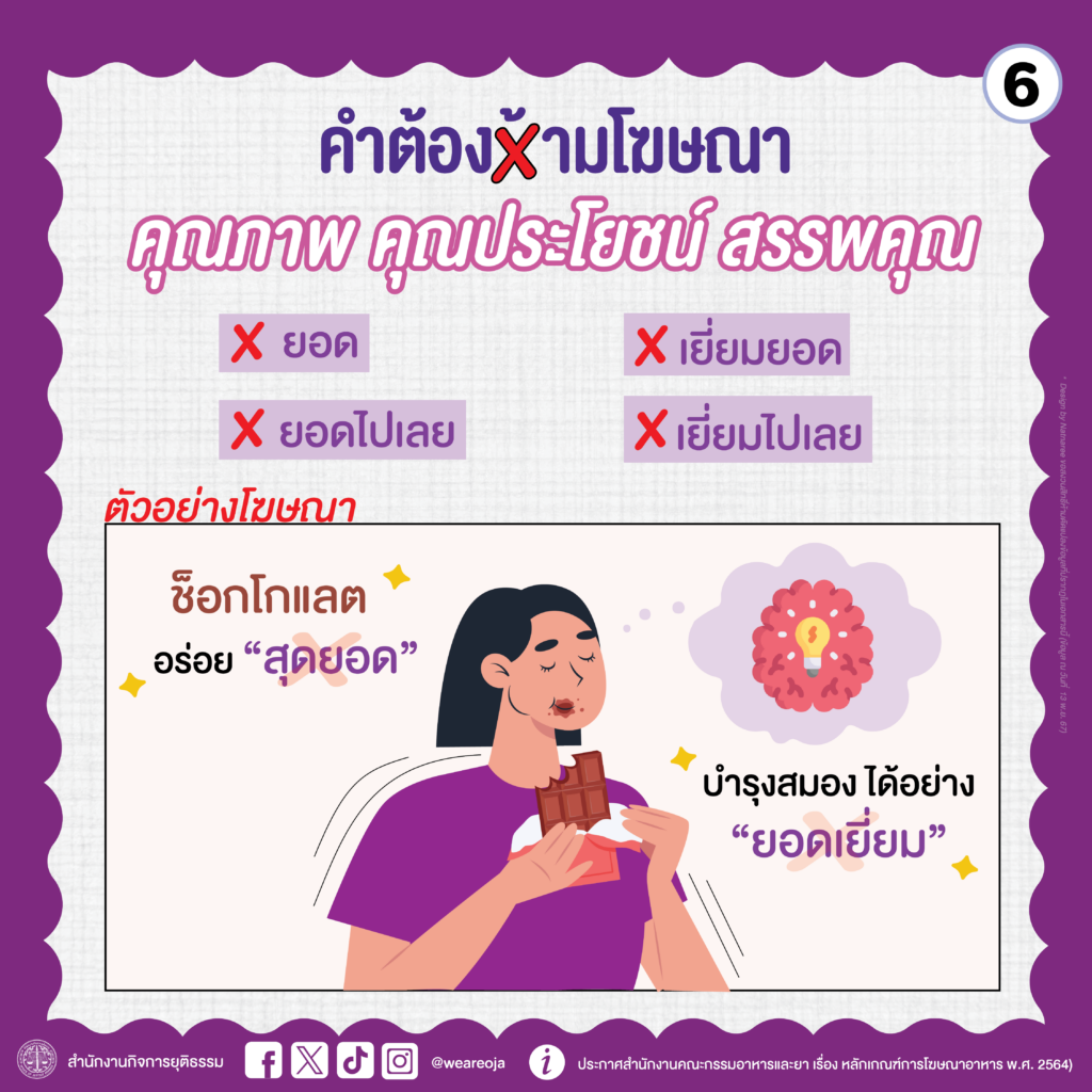คำต้องห้ามโฆษณา คุณภาพ คุณประโยชน์ สรรพคุณ (6-11) ได้แก่ ยอด เยี่ยมยอด ยอดไปเลย เยี่ยมไปเลย สุดยอด ยอดเยี่ยม