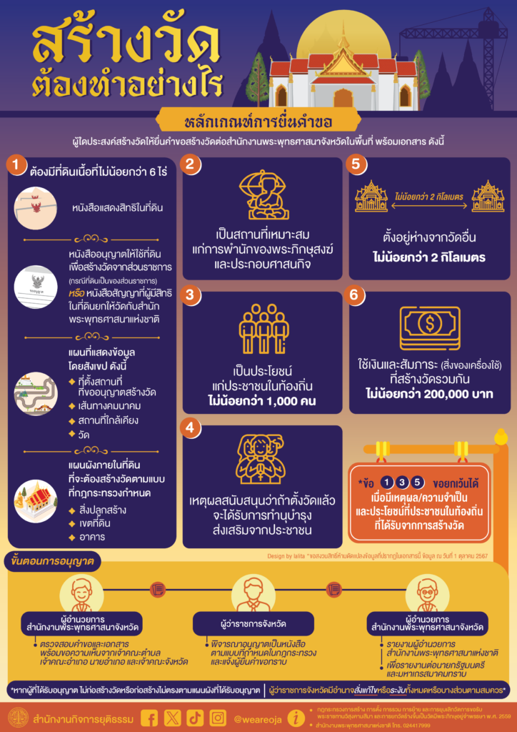 ที่ดิน ที่มีกรรมสิทธิ์หรือสิทธิครอบครอง ต้องยื่นคำขอสร้างวัด ต่อ ผ.อ.สำนักงานพระพุทธศาสนาฯ ในจังหวัดที่ที่ดินตั้งอยู่ พร้อมเอกสาร ดังนี้