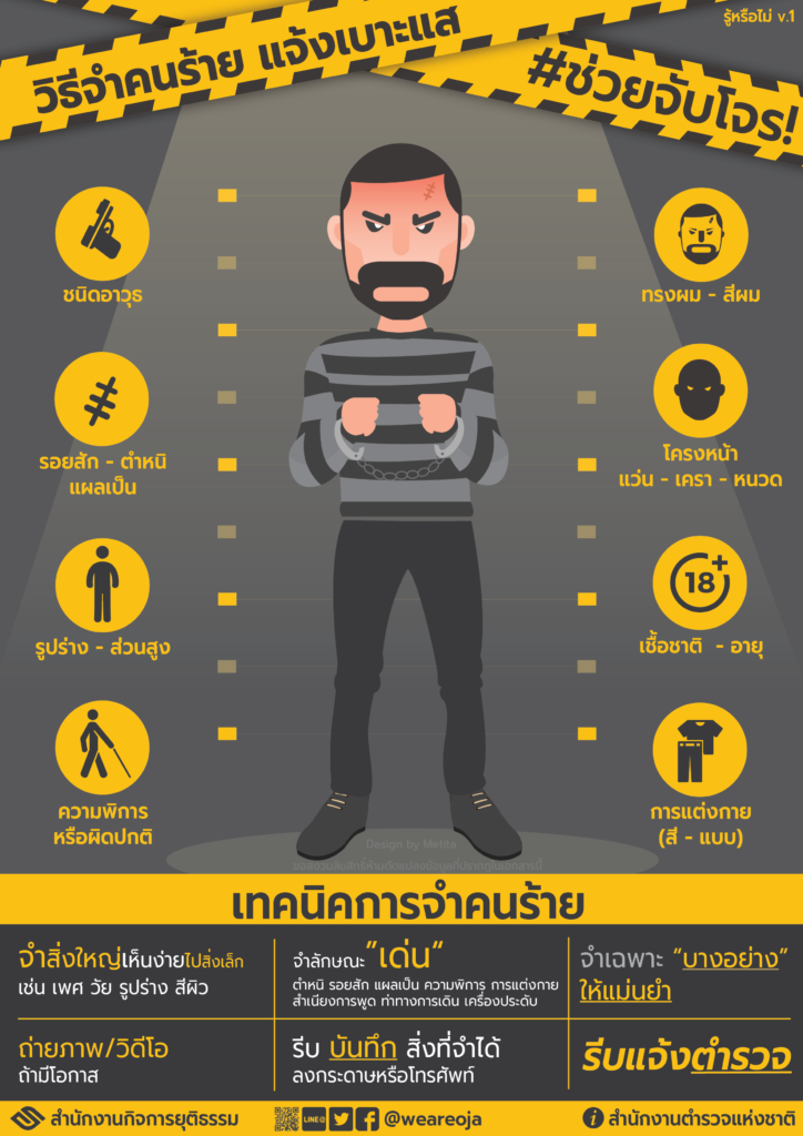 วิธีจำ ตำหนิรูปพรรณคนร้ายบ่อยครั้งเมื่อเกิดเหตุร้ายขึ้นผู้ที่ตกเป็นเหยื่อจะเกิดความหวาดกลัว จนขาดสติ และจดจำรูปพรรณสัณฐานของคนร้ายไม่ได้ และไม่สามารถให้เบาะแสตำรวจได้เท่าที่ควร คนร้ายจึงลอยนวลเพราะฉะนั้น เมื่อเกิดเหตุร้าย “ผู้ประสบเหตุ – ผู้เห็นเหตุการณ์” จะต้องทำอย่างไรบ้าง จึงจะจดจำคนร้ายให้ได้อย่างแม่นยำ?