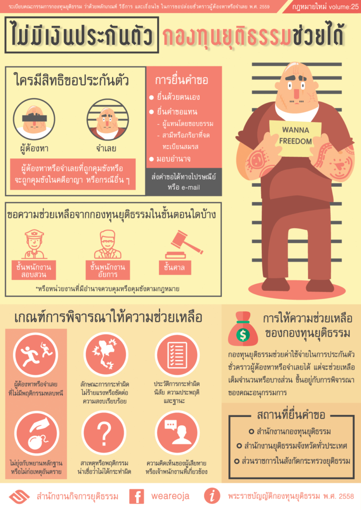 เอกสารอ้างอิง : ระเบียบคณะกรรมการกองทุนยุติธรรม ว่าด้วยหลักเกณฑ์ วิธีการ และเงื่อนไขในการช่วยเหลือประชาชนในการดำเนินคดี พ.ศ. 2559
