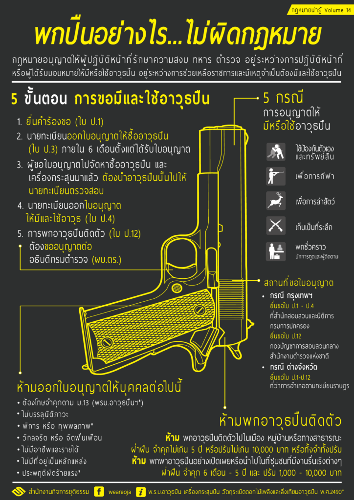 - การพกอาวุธปืนติดตัว (ใบ ป.12) ต้องขออนุญาตต่อ ผบ.ตร.