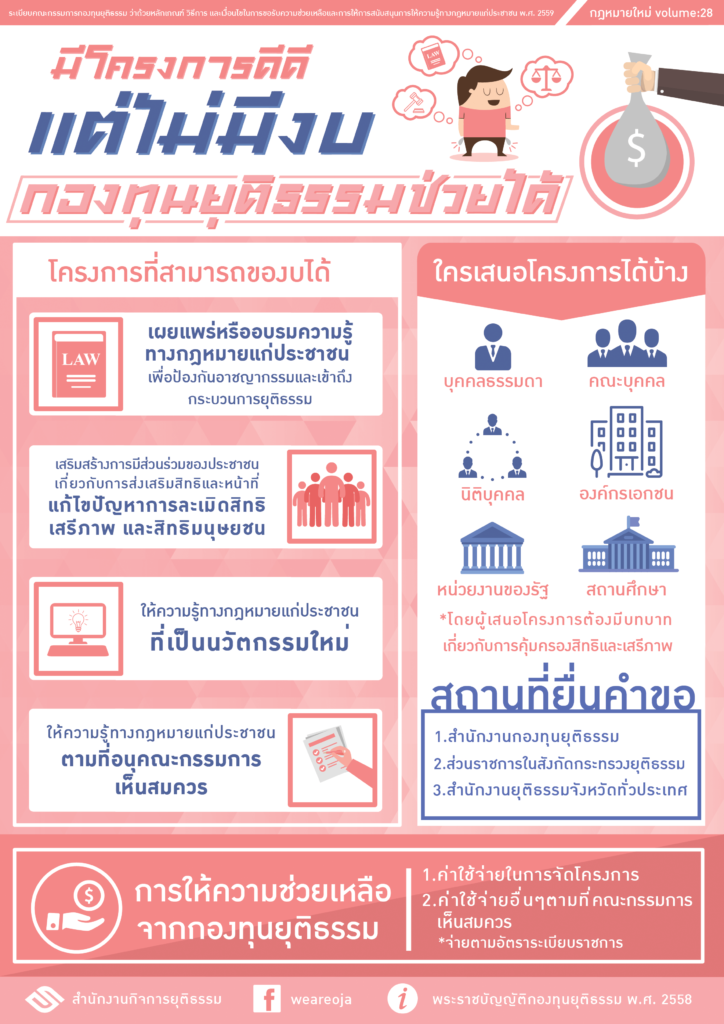 ลองศึกษารายละเอียดกันดูนะครับ : ระเบียบคณะกรรมการกองทุนยุติธรรม ว่าด้วยหลักเกณฑ์ วิธีการ และเงื่อนไขในการขอรับความช่วยเหลือและการให้การสนับสนุนการให้ความรู้ทางกฎหมายแก่ประชาชน พ.ศ. 2559