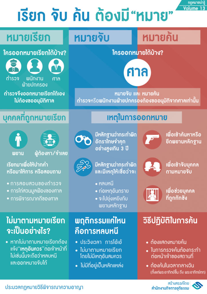วันนี้เรามาเรียนรู้กันว่า…ใครบ้างมีอำนาจออก หมายเรียก หมายจับ หมายค้น และเพราะเหตุใด? ต้องออกหมาย. และต้องปฏิบัติอย่างไร มาเรียนรู้กฎหมายง่ายๆผ่าน Infographic เรื่อง : เรียก จับ ค้น ต้องมี “หมาย”