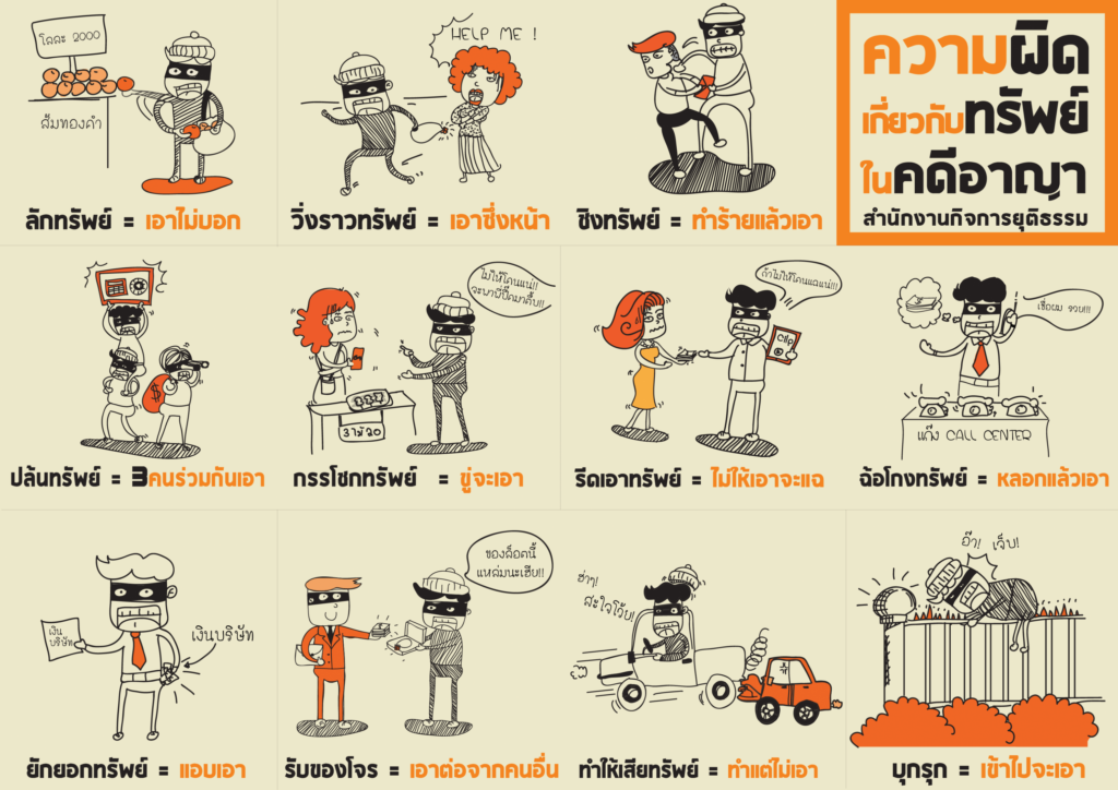 1. ลักทรัพย์ คือ การเอาทรัพย์ของผู้อื่นเป็นเจ้าของร่วมอยู่ด้วยโดยทุจริต เช่นการเอาสี่งของที่ของบุคคลอื่นวางไว้ไปขาย