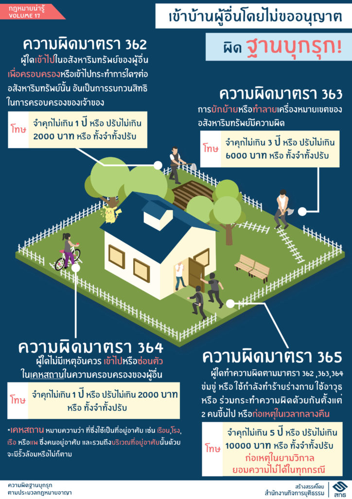 มาตรา 362 ผู้ใดเข้าไปในอสังหาริมทรัพย์ของผู้อื่น เพื่อถือการครอบครองอสังหาริมทรัพย์นั้นทั้งหมด หรือแต่บางส่วน หรือเข้าไปกระทำการใด ๆ อันเป็นการรบกวนการครอบครองอสังหาริมทรัพย์ของเขาโดยปกติสุข ต้องระวางโทษจำคุกไม่เกินหนึ่งปี หรือปรับไม่เกินสองหมื่นบาท หรือทั้งจำทั้งปรับ[อัตราโทษ แก้ไขเพิ่มเติมโดยมาตรา 4 แห่งพระราชบัญญัติแก้ไขเพิ่มเติมประมวลกฎหมายอาญา (ฉบับที่ 26) พ.ศ. 2560]