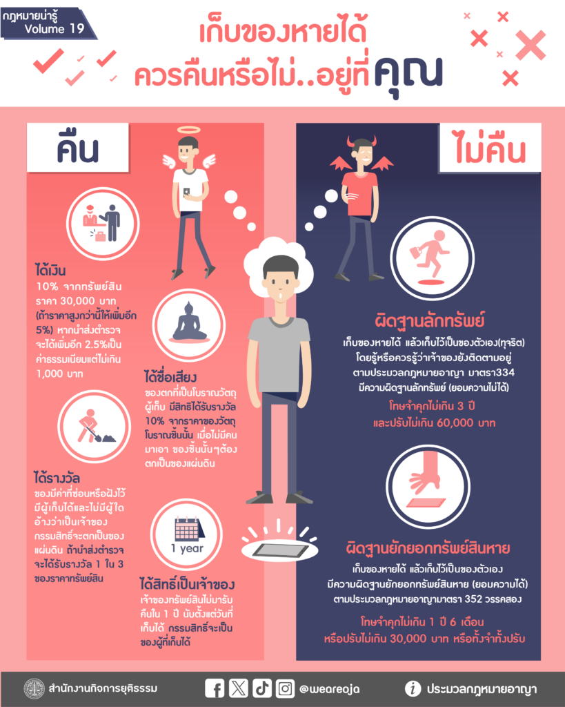 - ผิดฐานลักทรัพย์ – เก็บของหายได้ แล้วเก็บไว้เป็นของตัวเอง (ทุจริต) โดยรู้หรือควรรู้ว่าเจ้าของยังติดตามอยู่ตามประมวลกฎหมายอาญา มาตรา 334 มีความผิดฐานลักทรัพย์ (ยอมความไม่ได้) โทษจำคุกไม่เกิน 3 ปี และปรับไม่เกิน 60,000 บาท