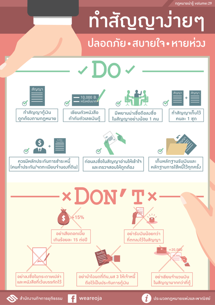 กฎหมายน่ารู้ : ทำสัญญาง่ายๆ ปลอดภัย สบายใจ หายห่วงก่อนที่เราจะยืมเงินใคร หรือให้ใครยืมเงิน ควรทำสัญญากู้เงินไว้เป็นหลักเป็นฐานนะครับวันนี้เราขอนำเสนอ 7 สิ่งที่ต้องทำ และ 5 สิ่งที่ห้ามทำ ในการทำสัญญาต่างๆ เพื่อความปลอดภัย และทำแล้วสบายใจ >>อย่าลืมนะครับ ก่อนทำสัญญาใดๆ ก็แล้วแต่ เราควรตรวจสอบสัญญา และข้อความโดยละเอียดถี่ถ้วนนะครับ ทั้งลูกหนี้และเจ้าหนี้ ทั้งนี้เพื่อผลประโยชน์ของเราทุกคนนะครับด้วยความปรารถนาดี จากสำนักงานกิจการยุติธรรม