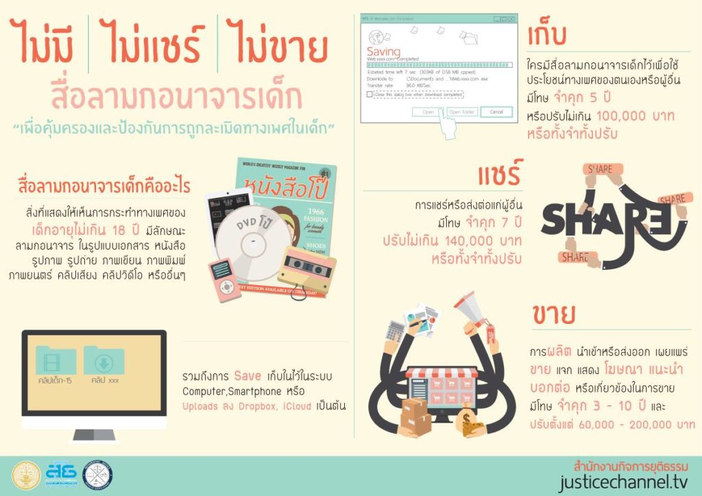 การแชร์หรือส่งต่อแก่ผู้อื่น มีโทษจำคุก 7 ปี ปรับไม่เกิน 140,000 บาท หรือทั้งจำทั้งปรับ