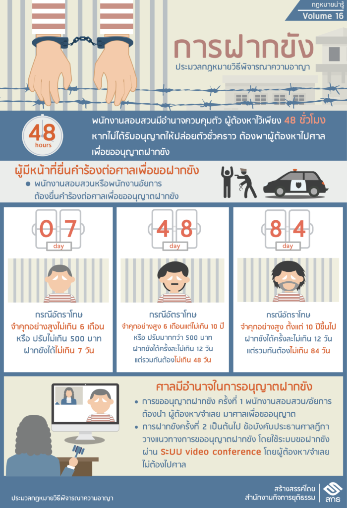 - กรณีอัตราโทษจำคุกอย่างสูง 6 เดือนแต่ไม่เกิน 10 ปี หรือปรับมากกว่า 500 บาท สามารถฝากขังได้ไม่เกิน 48 วัน