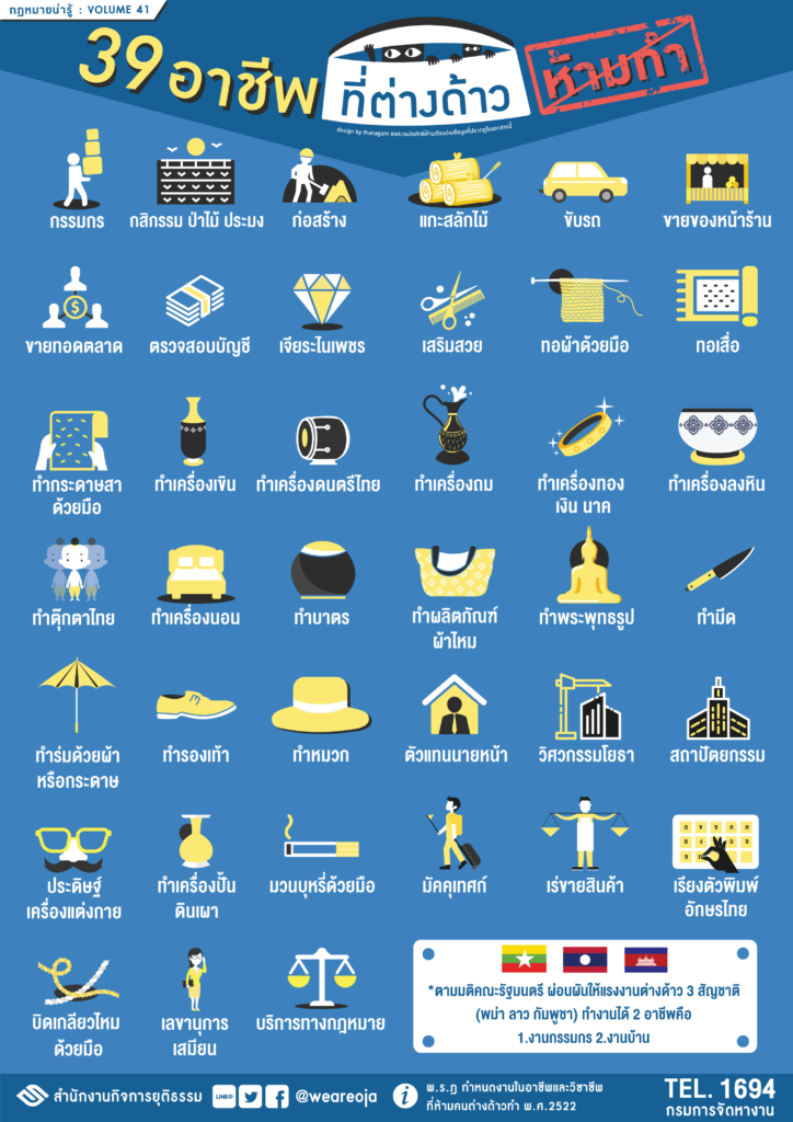 อาชีพอะไรบ้างที่คนต่างด้าวทำไม่ได้ ตามกฎหมายพระราชกฤษฎีกากำหนดงานในอาชีพและวิชาชีพที่ห้ามคนต่างด้าวทำ พ.ศ.2522 จำนวน 39 อาชีพ ได้แก่