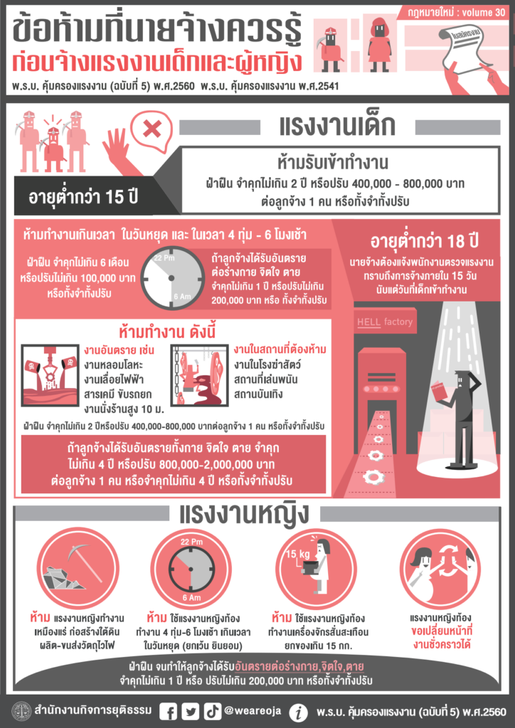 ที่มา : พระราชบัญญัติคุ้มครองแรงงาน พ.ศ. 2541 มาตรา 44, 45, 46, 47, 48, 49, 50, 51, 52 และพระราชบัญญัติ คุ้มครองแรงงาน (ฉบับที่ 7) พ.ศ. 2562