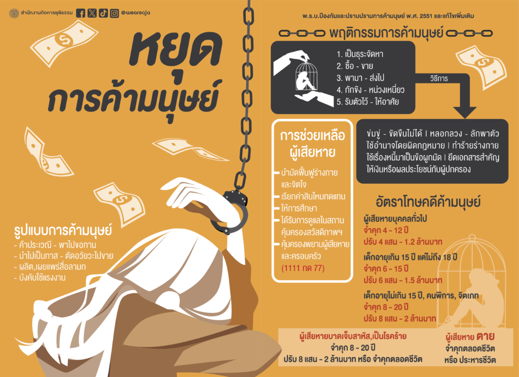 การช่วยเหลือผู้เสียหายจากการค้ามนุษย์ ทั้งด้านร่างกายและจิตใจ มีการเยียวยา ให้การศึกษา ดูแลในสถานคุ้มครองสวัสดิภาพ และคุ้มครองพยานผู้เสียหายและครอบครัว สามารถแจ้งเหตุได้ที่สายด่วน 1111 กด 77
