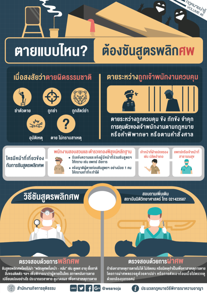 “การชันสูตรพลิกศพ” เป็นวิธีที่ดีที่สุดในการพิสูจน์หาสาเหตุการตาย สามารถตอบปัญหา และข้อสงสัยจากการตายได้ซึ่ง “การชันสูตรพลิกศพ” เป็นกระบวนการที่กำหนดขึ้นตามประมวลกฎหมายวิธีพิจารณาความอาญา มาตรา 148 ว่า….