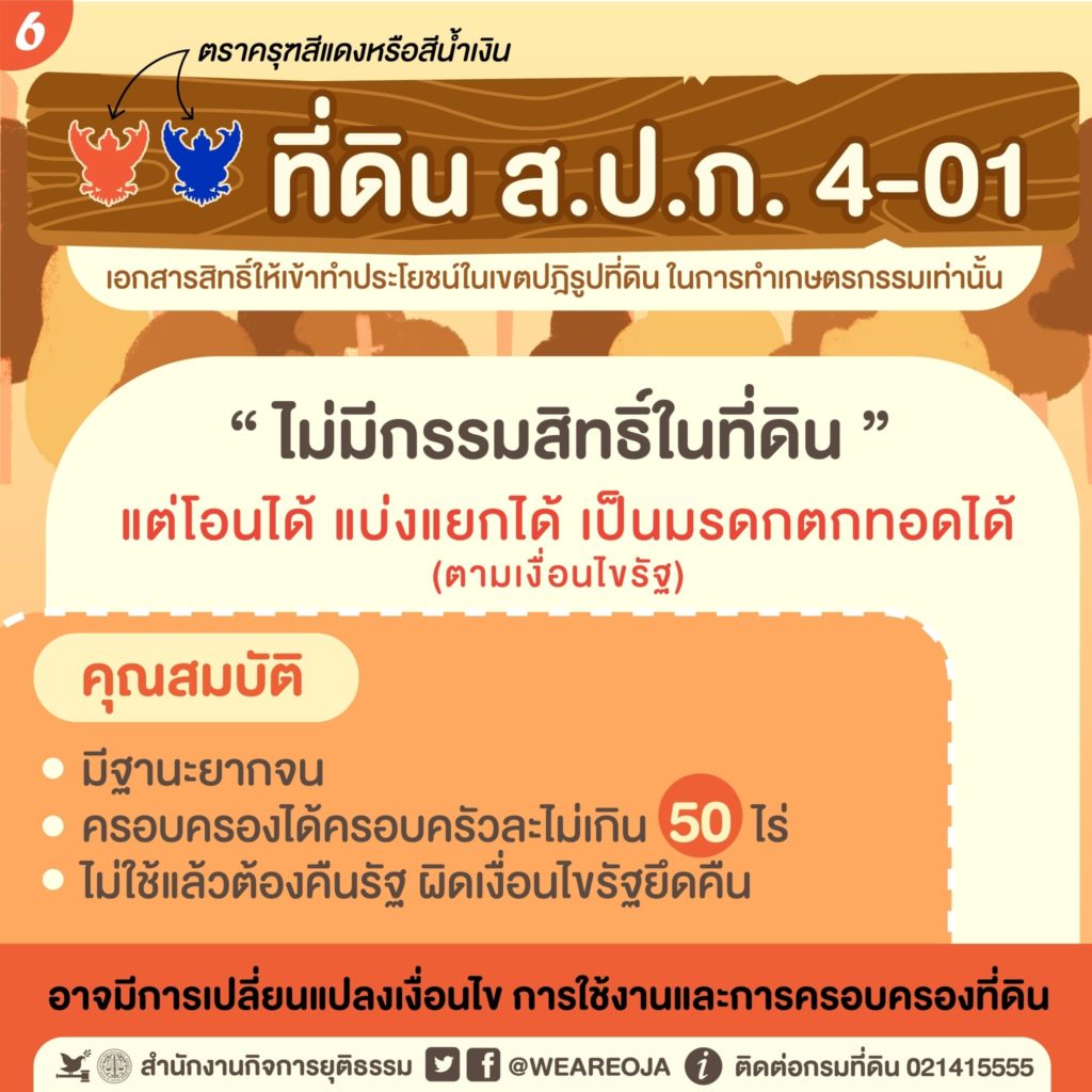 เอกสารสิทธิ์ ที่ดิน ส.ป.ก. 4-01 ครุฑแดง/ครุฑน้ำเงิน คือ เอกสารสิทธิ์ให้ประชาชนเข้าทำประโยชน์ในเขตปฎิรูปที่ดิน เป็น สิทธิในการทำเกษตรกรรม และการจัดที่อยู่อาศัยในที่ดินเพื่อเกษตรกรรม เจ้าของมีเพียงสิทธิในการครอบครองเพื่อใช้ประโยชน์ในการเกษตรเท่านั้น ไม่มีกรรมสิทธิ์ในที่ดิน ออกโฉนดไม่ได้ ห้ามซื้อห้ามขาย ห้ามโอนขายสิทธิ์ให้คนอื่น ที่ไม่ใช่ทายาทของเจ้าของสิทธิ และหากทายาทได้รับเป็นมรดกตกทอดไปแล้วก็ต้องใช้ประโยชน์โดยการทำเกษตรกรรมเท่านั้น