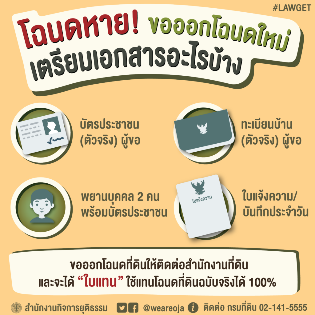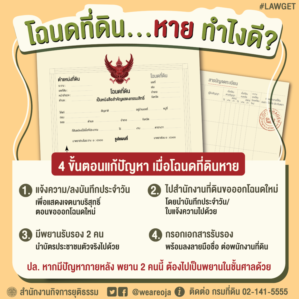 ซึ่งหากมีปัญหาภายหลังพยานทั้ง 2 คนจะต้องเป็นพยานในชั้นศาลด้วย ดำเนินการขอออกโฉนดใหม่หรือใบแทนหนังสือแสดงสิทธิ์ในที่ดินได้ที่สำนักงานที่ดิน