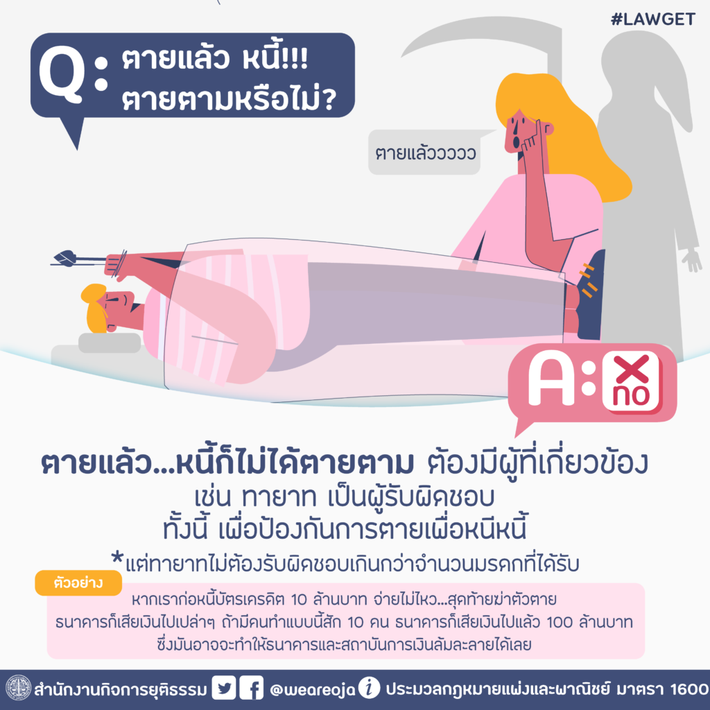 A : ไม่ได้!!! ตายแล้ว…หนี้ก็ไม่ได้ตายตาม ต้องมีผู้ที่เกี่ยวข้อง เช่น ทายาท เป็นผู้รับผิดชอบ ทั้งนี้ เพื่อป้องกันการตายเพื่อหนีหนี้ *แต่ทายาทไม่ต้องรับผิดชอบเกินกว่าจำนวนมรดกที่ได้รับ