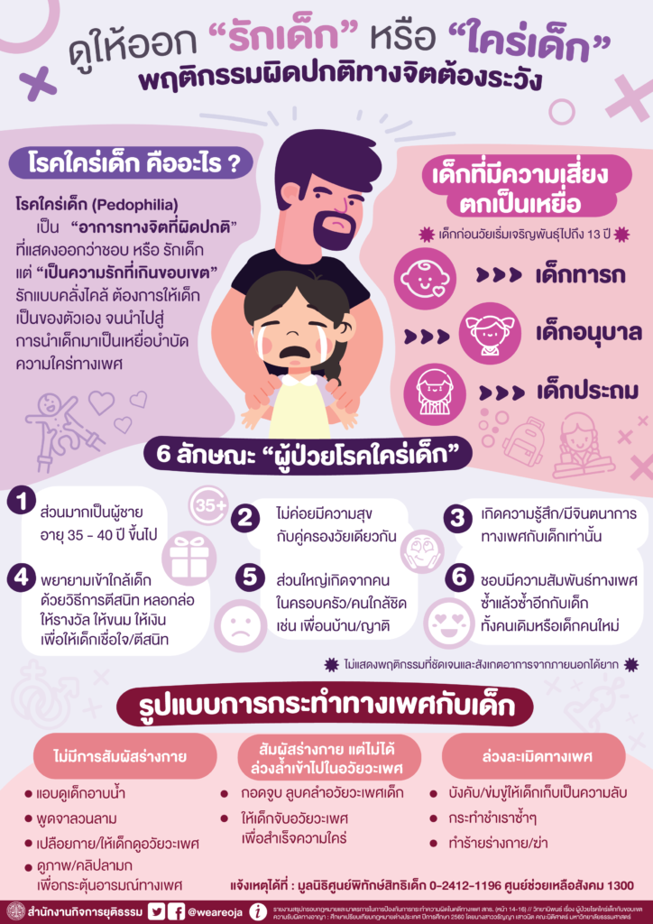 หมายเหตุ ปัจจุบันประเทศไทยยังไม่มีการกำหนดโทษและลงโทษโดยคำนึงถึงความผิดปกติทางจิต “โรคใคร่เด็ก” และอาจไม่เข้าข่ายเป็นผู้ป่วยทางจิตเวช ผู้ทำความผิดจึงมีความผิดและรับโทษตามประมวลกฎหมายอาญา