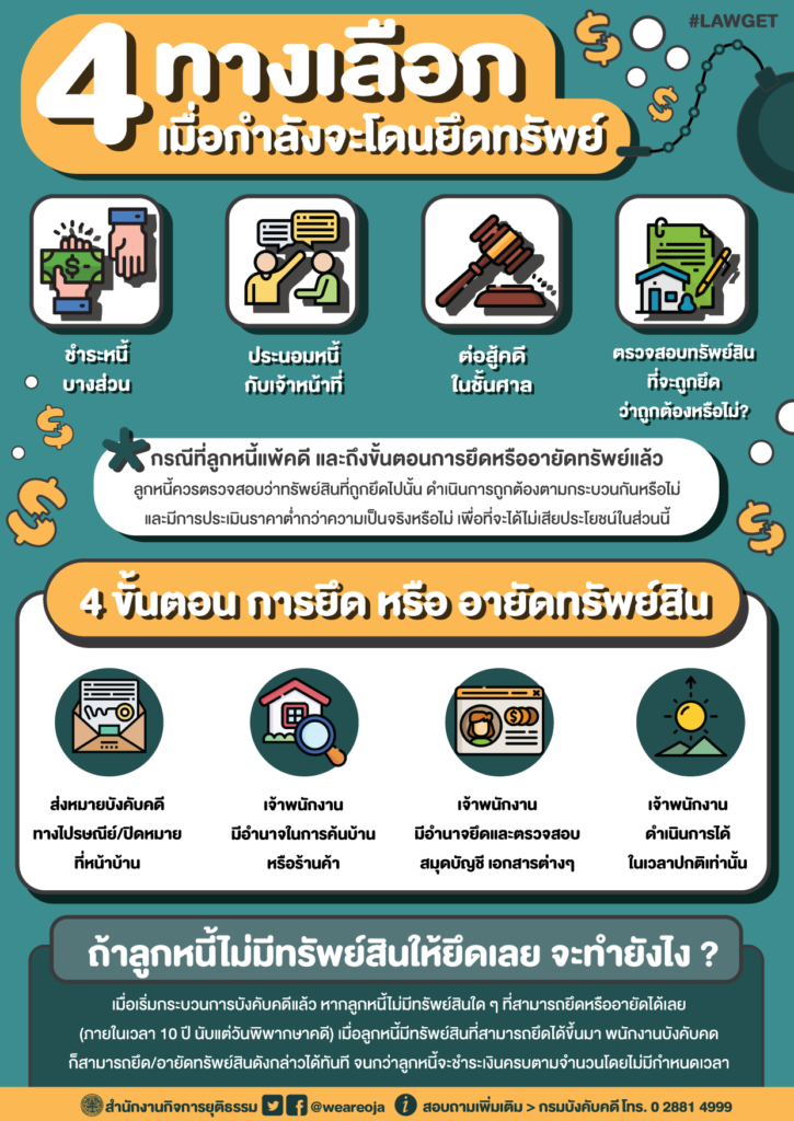 สอบถามเพิ่มเติมเกี่ยวกับการยึดหรืออายัดทรัพย์สิน กรมบังคับคดี โทร. 0 2881 4999