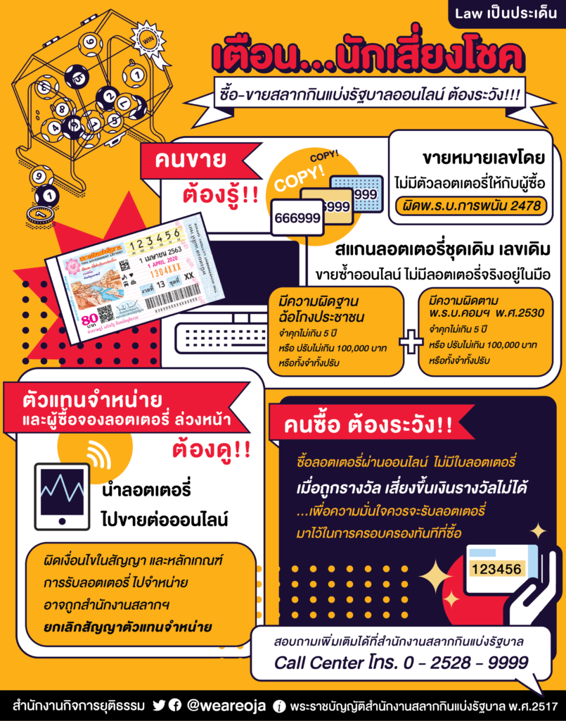 นำสลากฯไปขายต่อผ่านแพลตฟอร์มออนไลน์เป็นการกระทำที่ผิดเงื่อนไขในสัญญาและหลักเกณฑ์การรับสลากฯ ไปจำหน่าย อาจถูกสำนักงานสลากฯ ยกเลิกสัญญาตัวแทนจำหน่าย