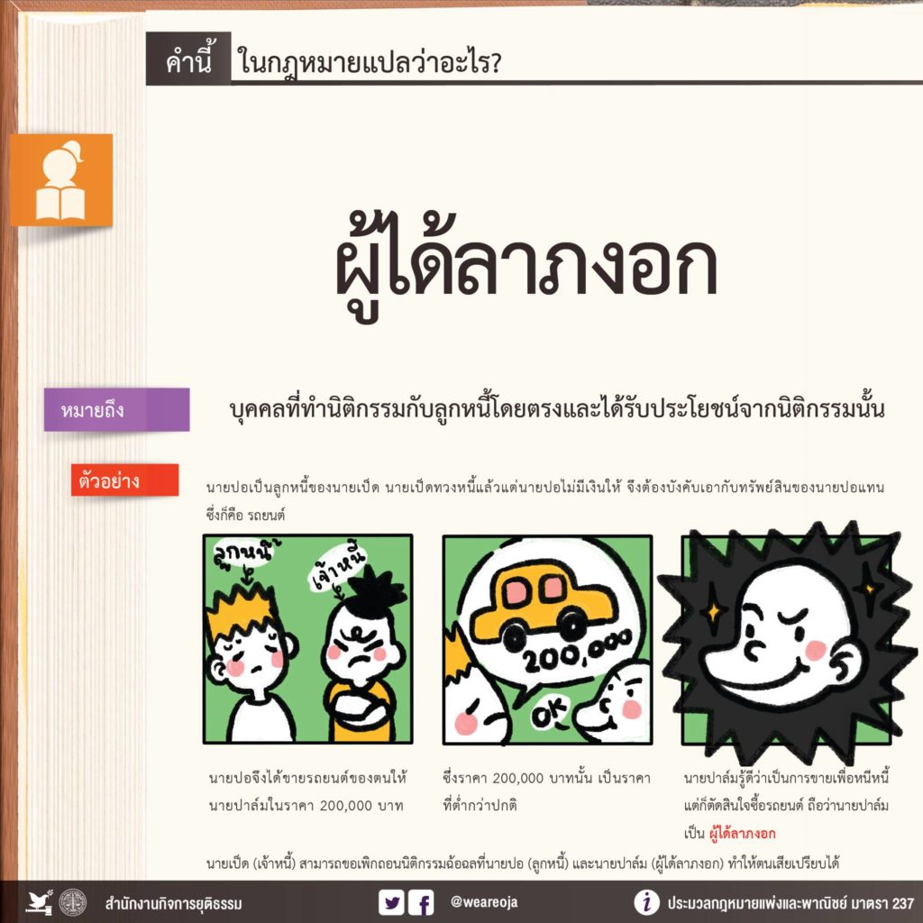 “ผู้ได้ลาภงอก” หมายถึง บุคคลที่ทำนิติกรรมกับลูกหนี้โดยตรงและได้รับประโยชน์จากนิติกรรมนั้น