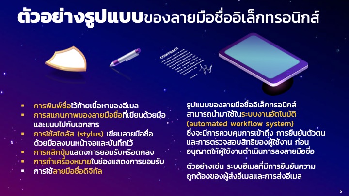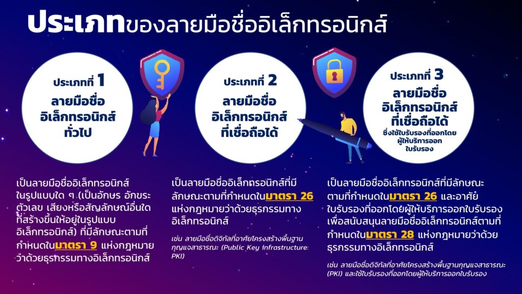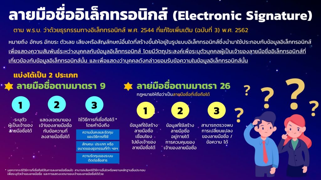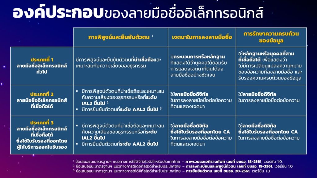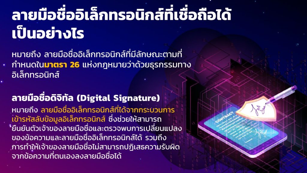 การลงลายมือชื่ออิเล็กทรอนิกส์ (Electronic Signature หรือ e-Signature) ก็เป็นองค์ประกอบสำคัญในการพิสูจน์และยืนยันตัวตนของผู้ลงนามในเอกสารอิเล็กทรอนิกส์ที่ส่งผ่านออนไลน์ ได้จัดทำ “ข้อเสนอแนะมาตรฐานด้านเทคโนโลยีสารสนเทศและการสื่อสารที่จำเป็นต่อธุรกรรมทางอิเล็กทรอนิกส์ ว่าด้วยแนวทางการลงลายมือชื่ออิเล็กทรอนิกส์ (ETDA Recommendation on ICT Standard for Electronic Transactions: Electronic Signature Guideline) เลขที่ ขมธอ. 23-2563” เพื่อเป็นแนวทางและมาตรฐานให้กับหน่วยงานภาครัฐและเอกชน ในการเลือกใช้วิธีการลงลายมือชื่ออิเล็กทรอนิกส์ให้เหมาะสมกับการทำธุรกรรมออนไลน์