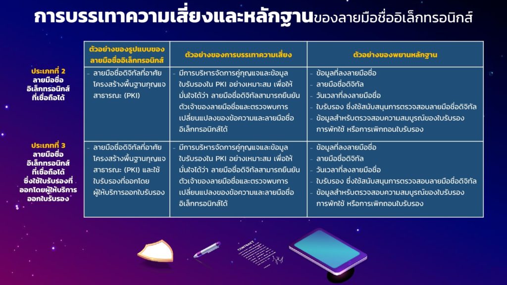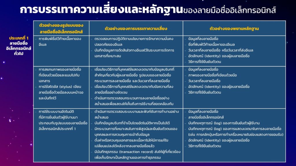 นอกจากนี้ ยังระบุถึงประเภทของลายมือชื่ออิเล็กทรอนิกส์ ที่แบ่งออกเป็น 3 ประเภท ได้แก่ ลายมือชื่ออิเล็กทรอนิกส์ทั่วไป ลายมือชื่ออิเล็กทรอนิกส์ที่เชื่อถือได้ และลายมือชื่ออิเล็กทรอนิกส์ที่เชื่อถือได้ซึ่งใช้ใบรับรองที่ออกโดยผู้ให้บริการออกใบรับรองหรือ CA ซึ่งลายมือชื่อแต่ละประเภทจะมีระดับความน่าเชื่อถือที่แตกต่างกัน พร้อมทั้งยังได้อธิบายถึงองค์ประกอบที่เป็นปัจจัยสำคัญของลายมือชื่ออิเล็กทรอนิกส์ทุกประเภท ได้แก่ องค์ประกอบในเรื่องการพิสูจน์และยืนยันตัวตน เจตนาในการลงลายมือชื่อ และการรักษาความครบถ้วนของข้อมูล ทั้งยังแนะนำการเลือกใช้ลายมือชื่อในแต่ละประเภทให้มีความน่าเชื่อถือ เหมาะสม รวมถึงข้อคำนึงในการวิเคราะห์และบรรเทาความเสี่ยงจากภัยคุกคามหรือเหตุการณ์ที่ลายมือชื่อจะไม่เป็นที่ยอมรับ