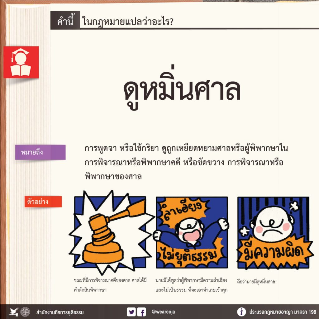 “ผู้ใดดูหมิ่นศาลหรือผู้พิพากษาในการพิจารณาหรือพิพากษาคดี หรือกระทำการขัดขวางการพิจารณาหรือพิพากษาของศาล ต้องระวางโทษจำคุกตั้งแต่ 1 – 7 ปี หรือปรับตั้งแต่ 20,000 – 140,000 บาท หรือทั้งจำทั้งปรับ”