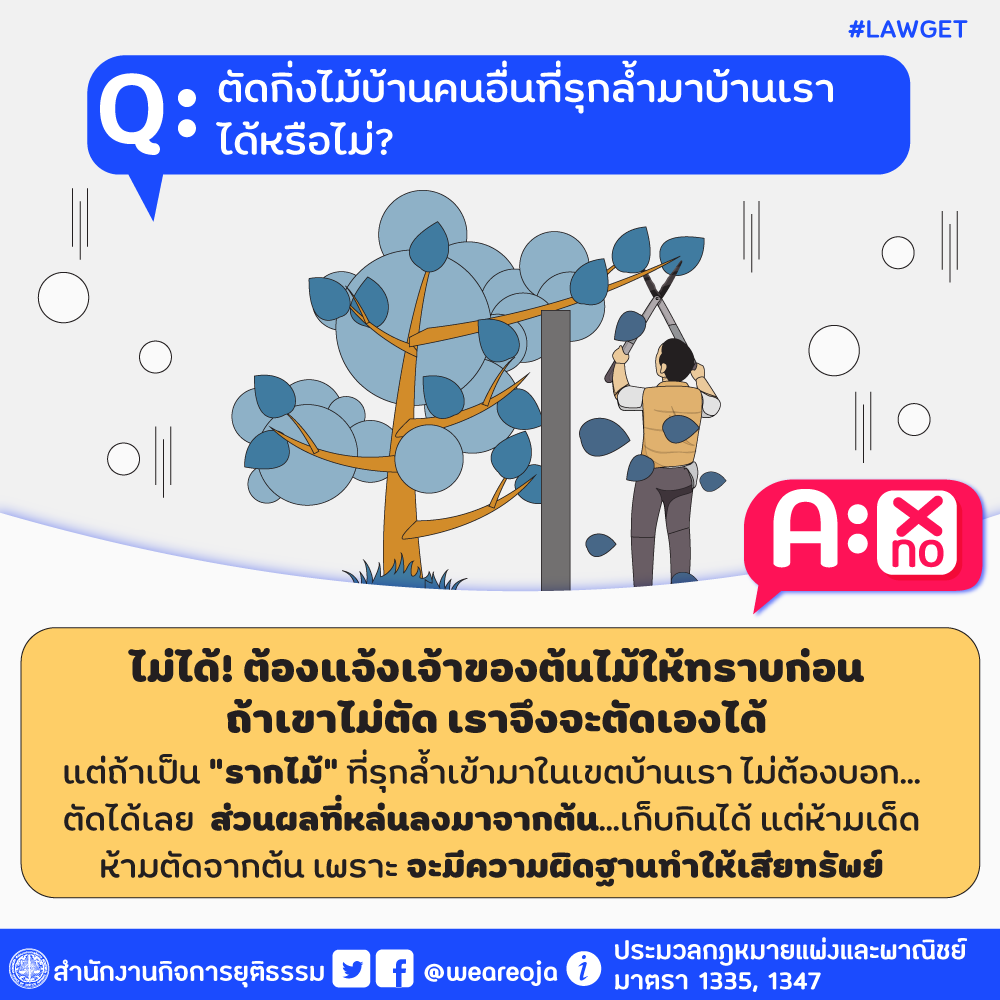 การจะตัดกิ่งไม้ของเพื่อนบ้านที่รุกล้ำมาในเขตของเรานั้น เราต้องแจ้งเจ้าของต้นไม้ให้ทราบก่อน ถ้าเขาไม่ตัด เราจึงจะตัดเองได้ แต่ถ้าเป็น ”รากไม้” ที่รุกล้ำเข้ามาในเขตบ้านเรานั้น ไม่ต้องบอก…สามารถตัดได้เลย และหากเป็นผลไม้ที่หล่นลงมาจากต้นไม้เพื่อนบ้าน…สามารถเก็บกินได้ แต่ห้ามเด็ด ห้ามตัดจากต้น เพราะ จะมีความผิดฐานทำให้เสียทรัพย์