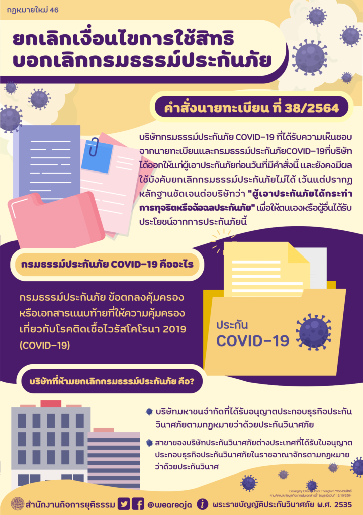 ในช่วงวิกฤต Covid-19 ที่ผ่านมาเทรนด์การซื้อประกันโรคระบาดเป็นอะไรได้รับความนิยมมากๆ…โดยแต่ละประกันมีการคุ้มครองหลากหลายรูปแบบ แต่ในช่วงหลังๆมา หลายบริษัทประกันภัย เริ่มมีการบอกเลิกกรมธรรม์ (แบบงงๆ) ซึ่งอาจจะมีหลายสาเหตุ ไม่ว่าด้วยเหตุผลอะไรก็ตาม ยังมีผู้เอาประกันภัยอีกหลายคนที่ได้รับผลกระทบจากเหตุการณ์นี้ จึงมีการปรับปรุงกฎหมายที่เกี่ยวข้องกับการยกเลิกกรมธรรม์ประกันภัยใหม่ สำนักงานกิจการยุติธรรมจึงได้ทำการสรุปการปรับปรุงแก้ไขกฎหมายฉบับนี้ ในรูปแบบ Infographic : เรื่อง ยกเลิกเงื่อนไขการใช้สิทธิบอกเลิกกรมธรรม์ประกันภัย