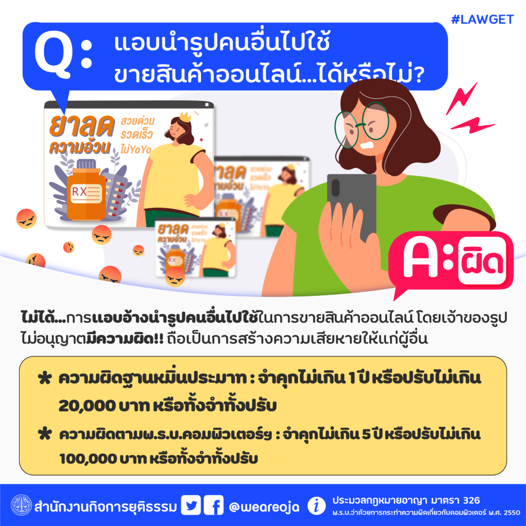 ใช่แล้วครับ..การแอบอ้างนำรูปคนอื่นไปใช้ในการขายสินค้าออนไลน์ต่างๆ โดยที่เจ้าของรูปไม่อนุญาตมีความผิด!! ถือเป็นการสร้างความเสียหายให้แก่ผู้อื่น โดยผู้ที่ฝ่าฝืนจะมีความผิดฐานหมิ่นประมาท มีโทษจำคุกไม่เกิน 1 ปี หรือปรับไม่เกิน 20,000 บาท หรือทั้งจำทั้งปรับ แถมยังมีความผิดตาม พ.ร.บ.คอมพิวเตอร์ฯ มีโทษจำคุกไม่เกิน 5 ปี หรือปรับไม่เกิน 100,000 บาท หรือทั้งจำทั้งปรับ