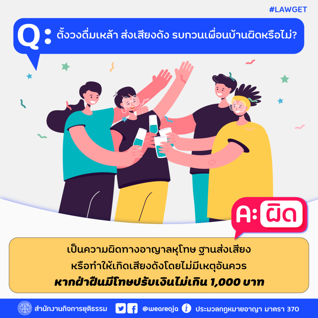 การตั้งวงดื่มสุราในช่วงเวลากลางคืน ส่งเสียงดังเอะอะโวยวาย หรือร้องเพลงขับกล่อมบรรเลง ส่งเสียงดังรบกวนเพื่อนบ้าน บริเวณใกล้เคียงจนเกิดความเดือดร้อน ถือเป็นความผิดทางอาญาลหุโทษ ฐานส่งเสียงหรือทำให้เกิดเสียงดังโดยไม่มีเหตุอันควร