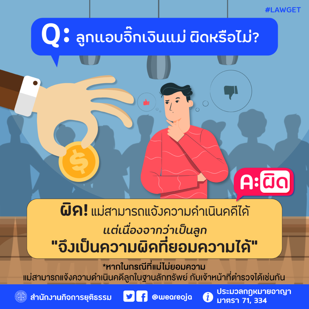 ลูกหลานบ้านไหนแอบจิ๊กเงินพ่อแม่บ่อยๆ โดยไม่บอกไม่กล่าวก่อน ถ้าหากแม่ไม่รู้ ก็แล้วไป เอ้ย! แต่ถ้าหากแม่รู้แล้วแม่ไม่ยอมความแล้วล่ะก็ แม่สามารถแจ้งความกับหน้าที่ตำรวจให้ดำเนินคดีกับลูกได้ แต่เนื่องจากว่าเป็นแม่ลูกกัน “จึงเป็นความผิดที่ยอมความได้”