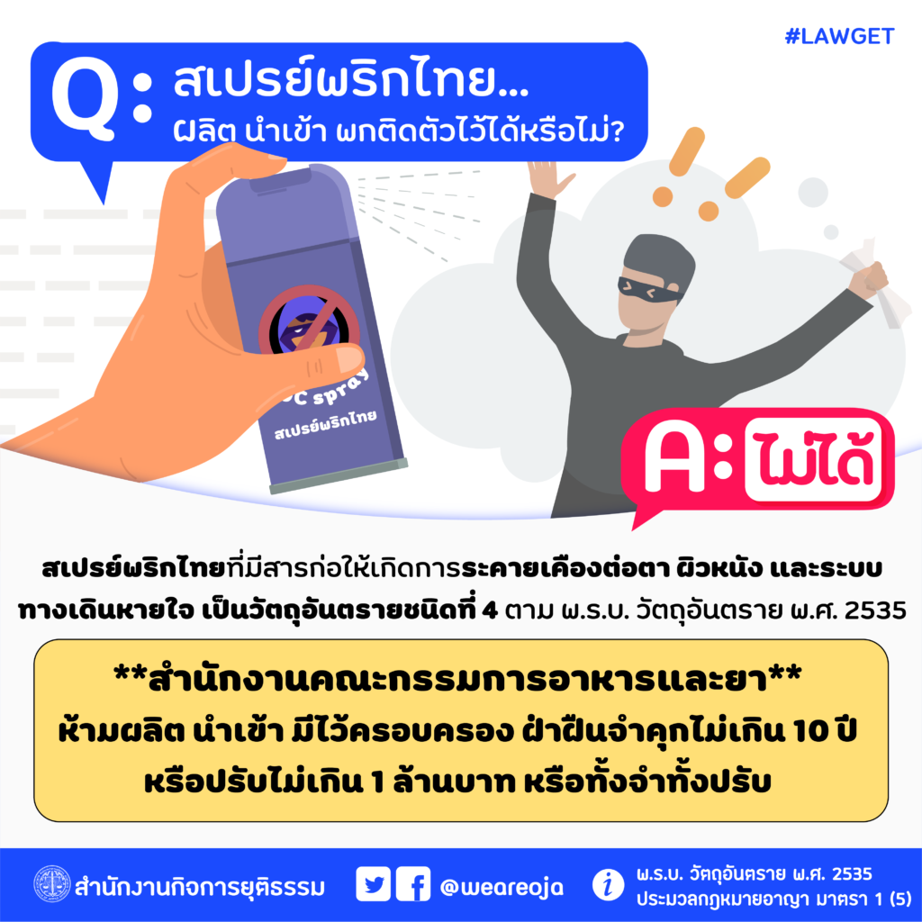 คำตอบ คือ ไม่ได้ อย่าว่าแต่พกสเปรย์พริกไทยติดตัวเลย จะผลิตหรือนำเข้าก็ไม่ได้ เพราะสเปรย์พริกไทย ที่มีสารก่อให้เกิดการระคายเคืองต่อตา ผิวหนัง และระบบทางเดินหายใจ เป็นวัตถุอันตราย ชนิดที่ 4 ตาม พ.ร.บ.วัตถุอันตราย พ.ศ. 2535 สำนักงานคณะกรรมการอาหารและยา (อย.) ห้ามผลิต นำเข้า มีไว้ครอบครอง ถ้าฝ่าฝืนมีโทษจำคุกไม่เกิน 10 ปี หรือปรับไม่เกิน 1 ล้านบาท หรือ ทั้งจำ ทั้งปรับ