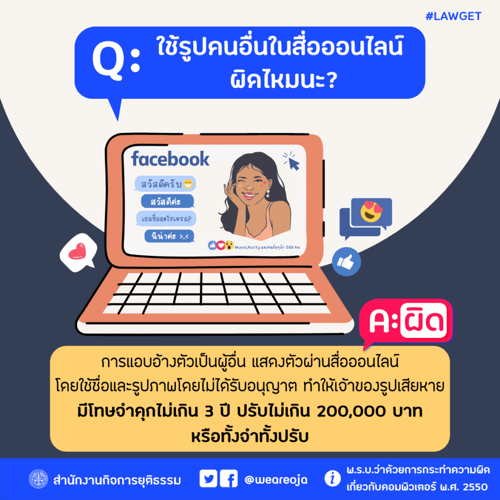 การแอบอ้างใช้ภาพคนอื่น โดยไม่ได้รับอนุญาต จนทำให้เจ้าของภาพเสียชื่อเสียง ถูกดูหมิ่น ถูกเกลียดชัง หรืออับอาย มีโทษจำคุกไม่เกิน 3 ปี และปรับไม่เกิน 200,000 บาท