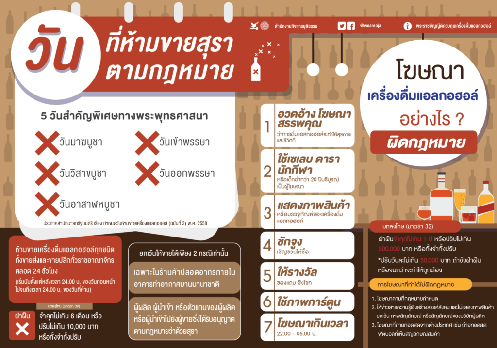 พบเห็นการกระทำผิดร้องเรียนได้ที่ สายด่วนกรมควบคุมโรค โทร. 1422 หรือ สำนักงานคณะกรรมการควบคุมเครื่องดื่มแอลกอฮอล์ โทร. 02 590 3342