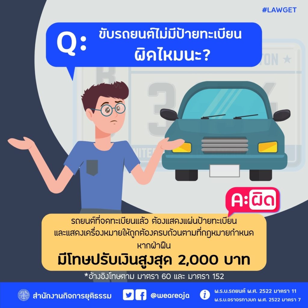 พระราชบัญญัติรถยนต์ พ.ศ. 2522 หมวด 1 การจดทะเบียน เครื่องหมาย และการใช้รถ มาตรา 11 รถที่จดทะเบียนแล้ว ต้องมีและแสดงแผ่นป้ายและเครื่องหมาย ครบถ้วนถูกต้องตามที่กำหนดในกฎกระทรวง หมวด 4 บทกำหนดโทษ มาตรา 60 ผู้ใดฝ่าฝืนหรือไม่ปฏิบัติตาม มาตรา 11 ต้องระวางโทษ ปรับไม่เกินสองพันบาท