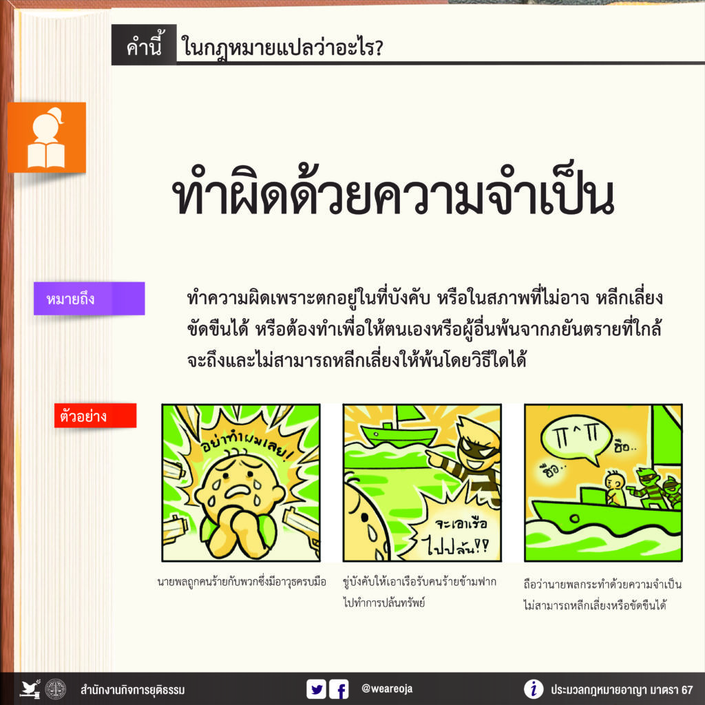 ผู้ใด #กระทำความผิดด้วยความจำเป็น ตามประมวลกฎหมายอาญา มาตรา 67 (1) เพราะอยู่ในที่บังคับ หรือภายใต้อำนาจ ซึ่งไม่สามารถหลีกเลี่ยงหรือขัดขืนได้ หรือ (2) เพราะเพื่อให้ตนเองหรือผู้อื่นพ้นจากภยันตรายที่ใกล้จะถึงและไม่สามารถหลีกเลี่ยงให้พ้นโดยวิธีอื่นใดได้ เมื่อภยันตรายนั้นตนมิได้ก่อให้เกิดขึ้นเพราะความผิดของตน ถ้าการกระทำนั้นไม่เป็นการเกินสมควรแก่เหตุแล้ว ผู้นั้นไม่ต้องรับโทษ