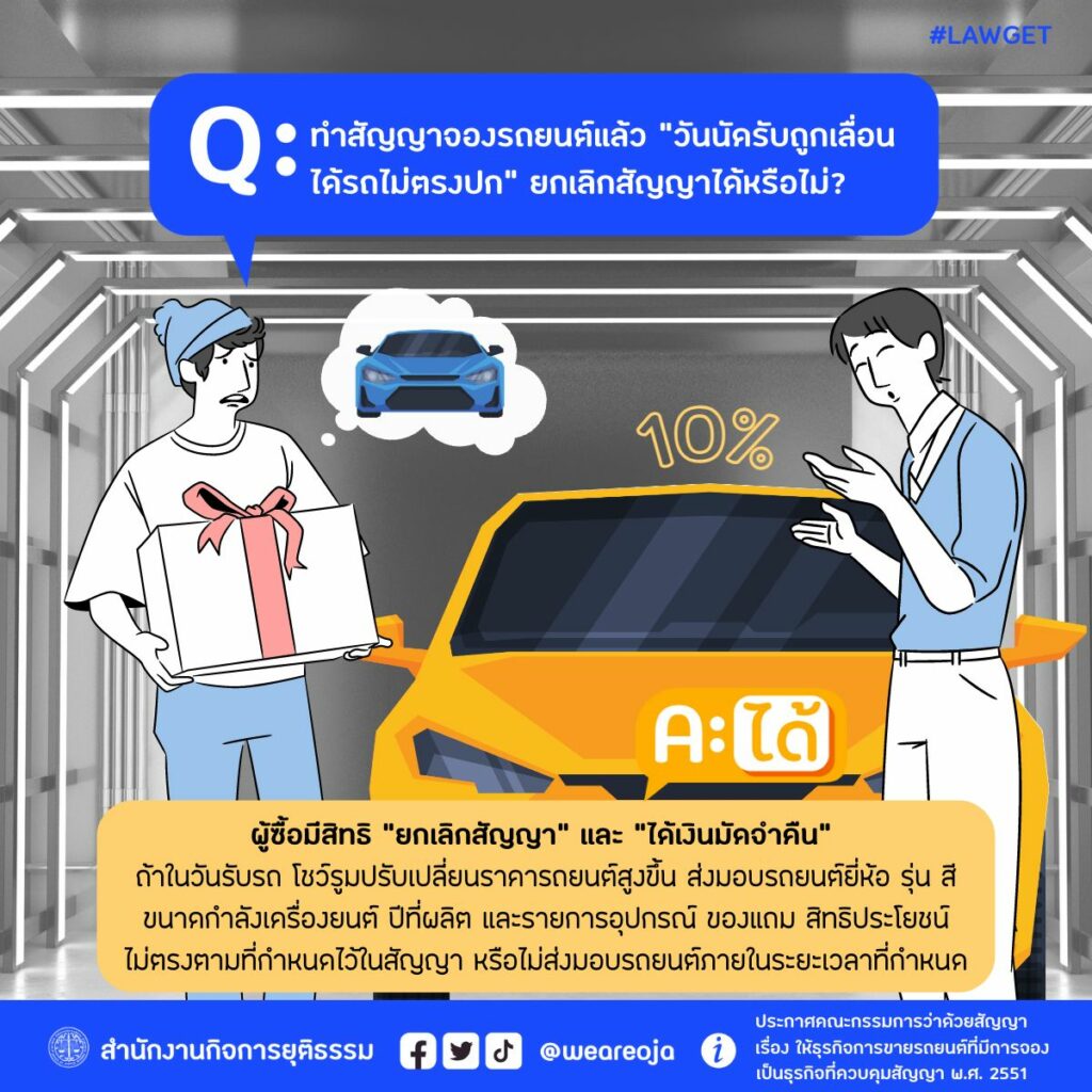 #ผู้ซื้อ มีสิทธิ #ยกเลิกสัญญา และ “ได้เงินมัดจำคืน” ถ้าในวันรับรถ โชว์รูมปรับเปลี่ยนราคารถยนต์สูงขึ้น ส่งมอบรถยนต์ยี่ห้อ รุ่น สี ขนาดกำลังเครื่องยนต์ ปีที่ผลิต และรายการอุปกรณ์ ของแถม สิทธิประโยชน์ ไม่ตรงตามที่กำหนดไว้ในสัญญา หรือไม่ส่งมอบรถยนต์ภายในระยะเวลาที่กำหนด