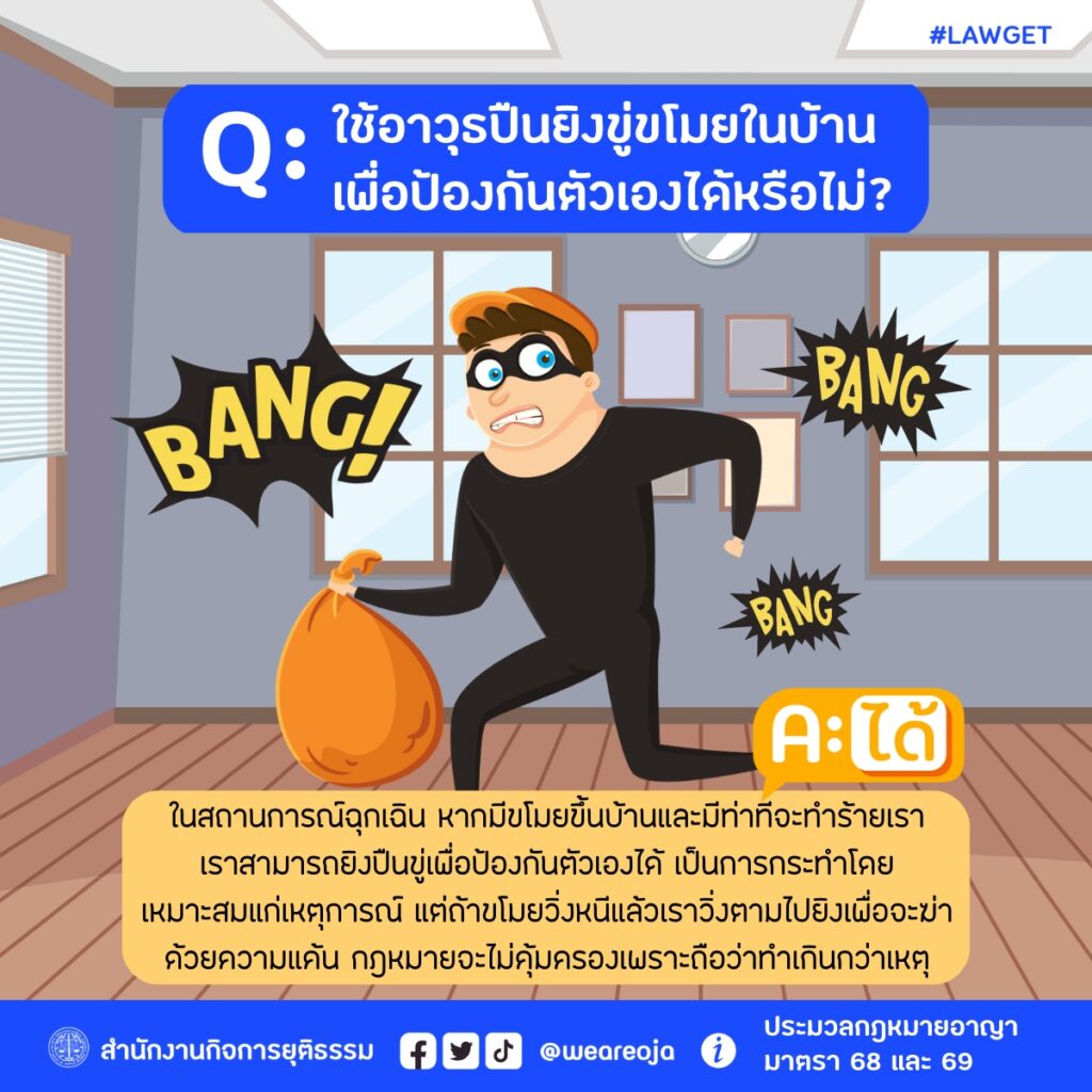 “เมื่อมีขโมยเข้าบ้านและมีท่าทีจะทำร้ายเรา แต่เราใช้ปืนยิงขู่เพื่อป้องกันตัวและให้โจรหยุดการกระทำ ถือว่าเป็นการกระทำโดยสมควรแก่เหตุและเป็นการป้องกันโดยชอบด้วยกฎหมายจึงไม่มีความผิด แต่ถ้าขโมยวิ่งหนีแล้วเราวิ่งตามไปยิงเพื่อจะฆ่าด้วยความแค้น กฎหมายจะไม่คุ้มครองเพราะถือว่าทำเกินกว่าเหตุ…”