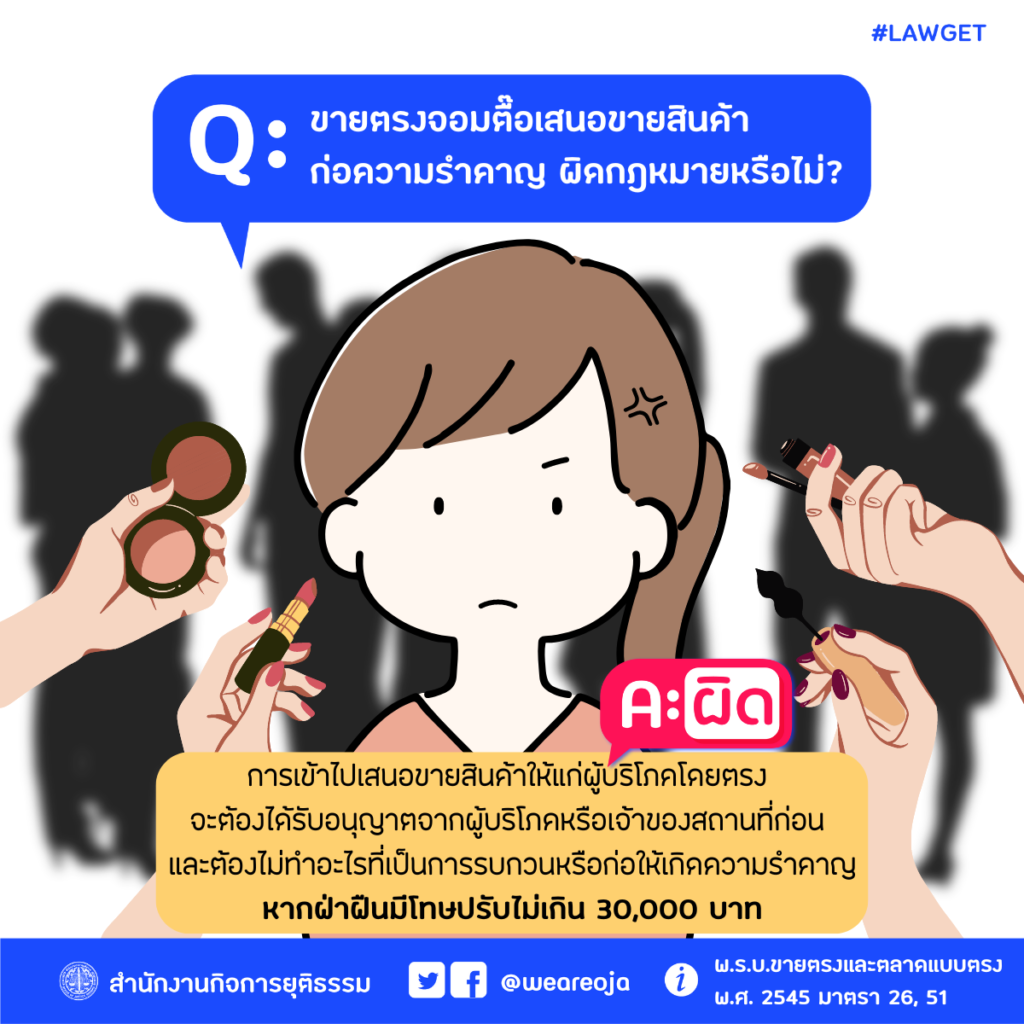 ขายตรงต้องได้รับอนุญาตก่อน เมื่อไปทำธุระตามห้างสรรพสินค้าหรือสถานที่พักผ่อนในร่ม หลายๆ คนอาจจะเคยเจอกลุ่มคนทั้งชายและหญิงที่ดักแจกใบปลิว ขายโปรโมชั่น อยู่ตามทางเดินและรบเร้าให้ซื้อบริการความสวยความงาม อาจสร้างความไม่สบายใจหรือก่อความรำคาญให้กับผู้ที่พบเห็นเป็นอย่างมาก ในการเข้าไปเสนอขายสินค้าให้กับผู้บริโภคโดยตรงนั้น จำเป็นที่จะต้องได้รับการอนุญาตจากผู้บริโภคหรือเจ้าของสถานที่เสียก่อน และต้องไม่ทำอะไรที่เป็นการรบกวนหรือก่อให้เกิดความรำคาญจนเกินไป หากผู้ขายฝ่าฝืนมีโทษปรับไม่เกิน 30,000 บาท ตามพระราชบัญญัติขายตรงและตลาดแบบตรง พ.ศ. 2545 พระราชบัญญัติขายตรงและตลาดแบบตรง พ.ศ. 2545 มาตรา 26 ในการเข้าไปติดต่อเพื่อเสนอขายสินค้าให้แก่ผู้บริโภคโดยตรง ณ ที่อยู่อาศัยหรือสถานที่ทำงานของผู้บริโภคหรือของผู้อื่น หรือสถานที่อื่นที่มิใช่สถานที่ประกอบการค้าเป็นปกติธุระ ผู้จำหน่ายอิสระหรือตัวแทนขายตรงจะต้องได้รับอนุญาตจากผู้บริโภคหรือผู้ครอบครองสถานที่นั้นก่อนและต้องไม่กระทำการอันเป็นการรบกวนหรือก่อให้เกิดความรำคาญแก่บุคคลดังกล่าว ในการนี้ผู้จำหน่ายอิสระหรือตัวแทนขายตรงต้องแสดงบัตรประจำตัวประชาชนและบัตรประจำตัวผู้จำหน่ายอิสระหรือตัวแทนขายตรงซึ่งออกโดยผู้ประกอบธุรกิจขายตรงด้วย มาตรา 51 ผู้ใดฝ่าฝืน มาตรา 26, มาตรา 30 วรรคหนึ่ง หรือมาตรา 37 ต้องระวางโทษปรับไม่เกินสามหมื่นบาท เสียงความรู้กฎหมาย ตอนที่ 233 ขายตรงจอมตื๊อ อ้างอิง: พระราชบัญญัติขายตรงและตลาดแบบตรง พ.ศ. 2545 Lawgetขายของขายตรงรำคาญ FacebookFacebookXTwitterLINELine