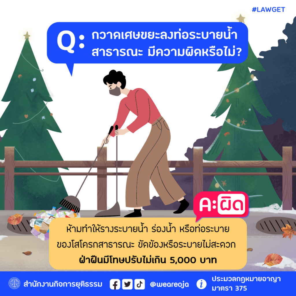 “รู้หรือไม่ว่าการกวาดเศษขยะลงในท่อระบายน้ำ ทำให้ท่อระบายน้ำอุดตัน ทางน้ำไหลไม่สะดวก ผิดกฎหมายและมีโทษถูกปรับได้ ไม่ว่าจะหน้าบ้านของเจ้าของบ้านเองหรือบนท้องถนน หากเป็นที่สาธารณะก็เข้าข่ายผิดกฎหมายได้ทั้งนั้น…”