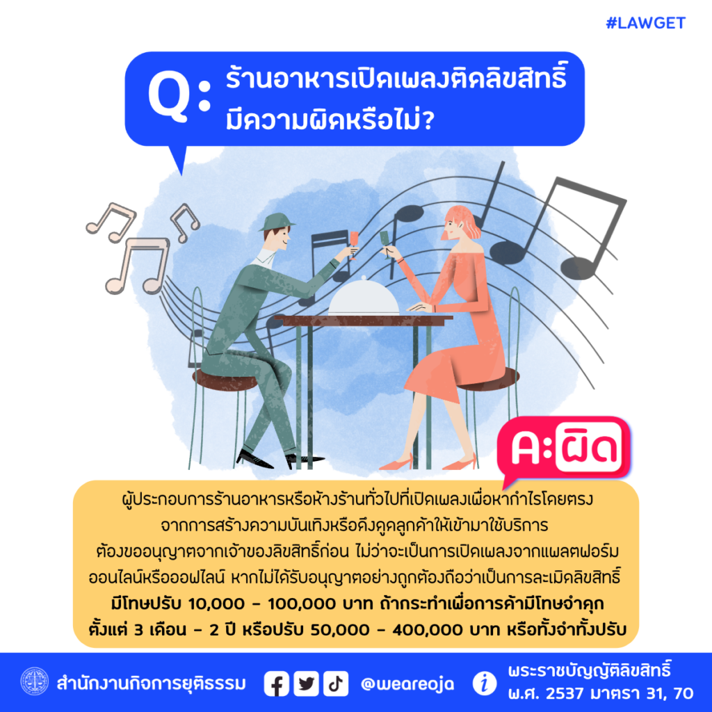 “หากทางเจ้าของร้านจะเปิดเพลงเพื่อสร้างบรรยากาศภายในร้านอาหาร ก็ควรที่จะต้องรีบตรวจสอบว่าเพลงที่จะใช้เปิดมีเจ้าของลิขสิทธิ์หรือไม่ และดำเนินการเจรจาหรือชำระค่าลิขสิทธิ์ให้ถูกต้องตามกฎหมาย“
