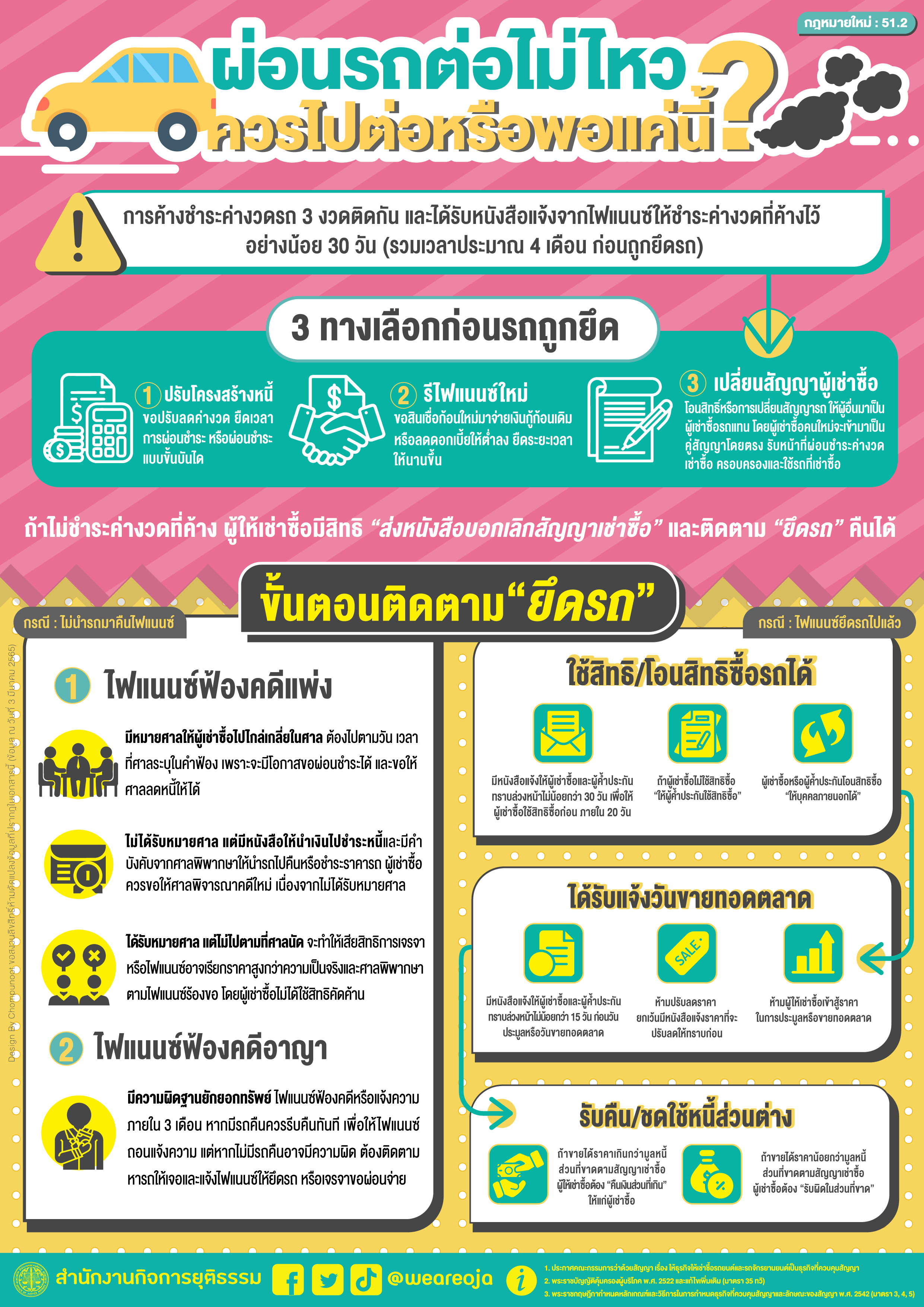 #กฎหมายใหม่ 51.2 ผ่อนรถต่อไม่ไหว ควรไปต่อหรือพอแค่นี้ การค้างชำระค่างวดรถ 3 งวดติดกัน และได้รับหนังสือแจ้งจากไฟแนนซ์ให้ชำระค่างวดที่ค้างไว้ อย่างน้อย 30 วัน (รวมเวลาประมาณ 4 เดือน ก่อนถูกยึดรถ) มี 3 ทางเลือกก่อนรถถูกยึด คือ